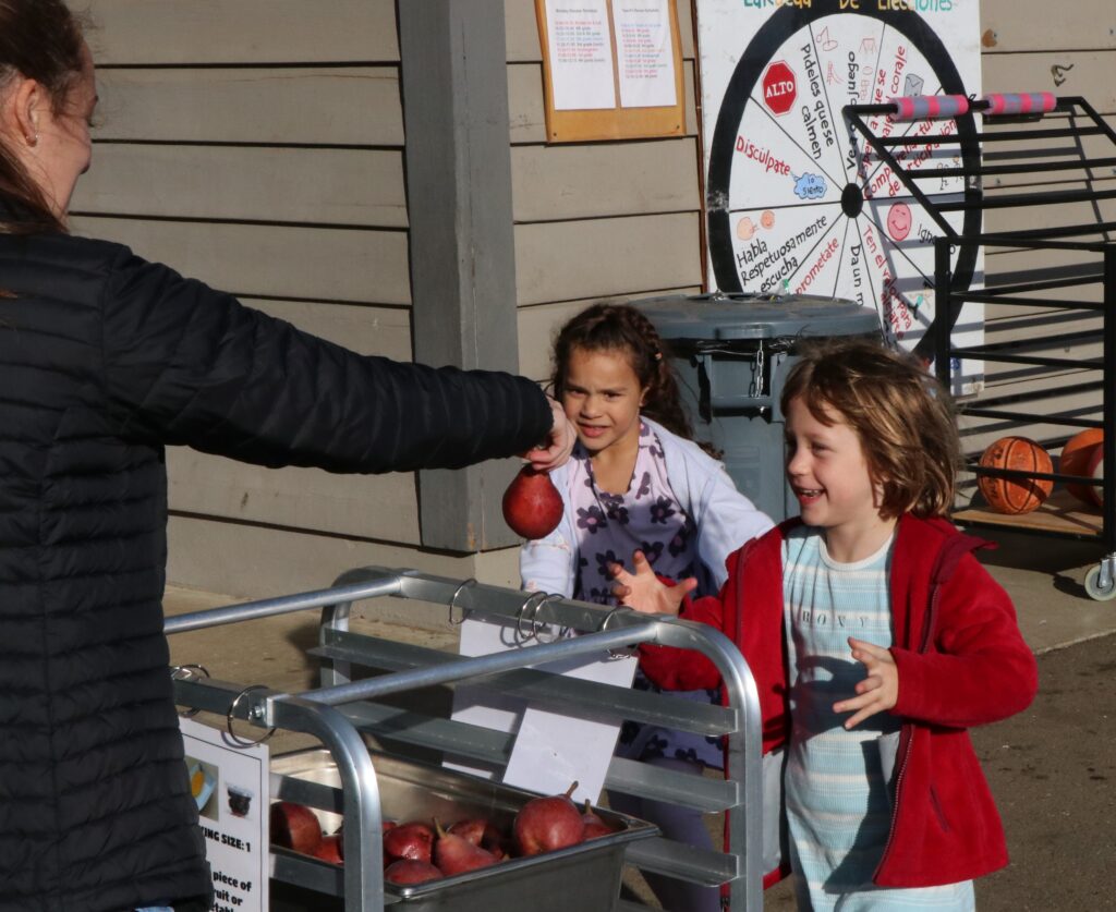 On a crisp but sunny fall morning, Westside Elementary students came running during recess for pears from a local Hood River orchard. They bit into the juicy fruit and then darted off to play some more.
