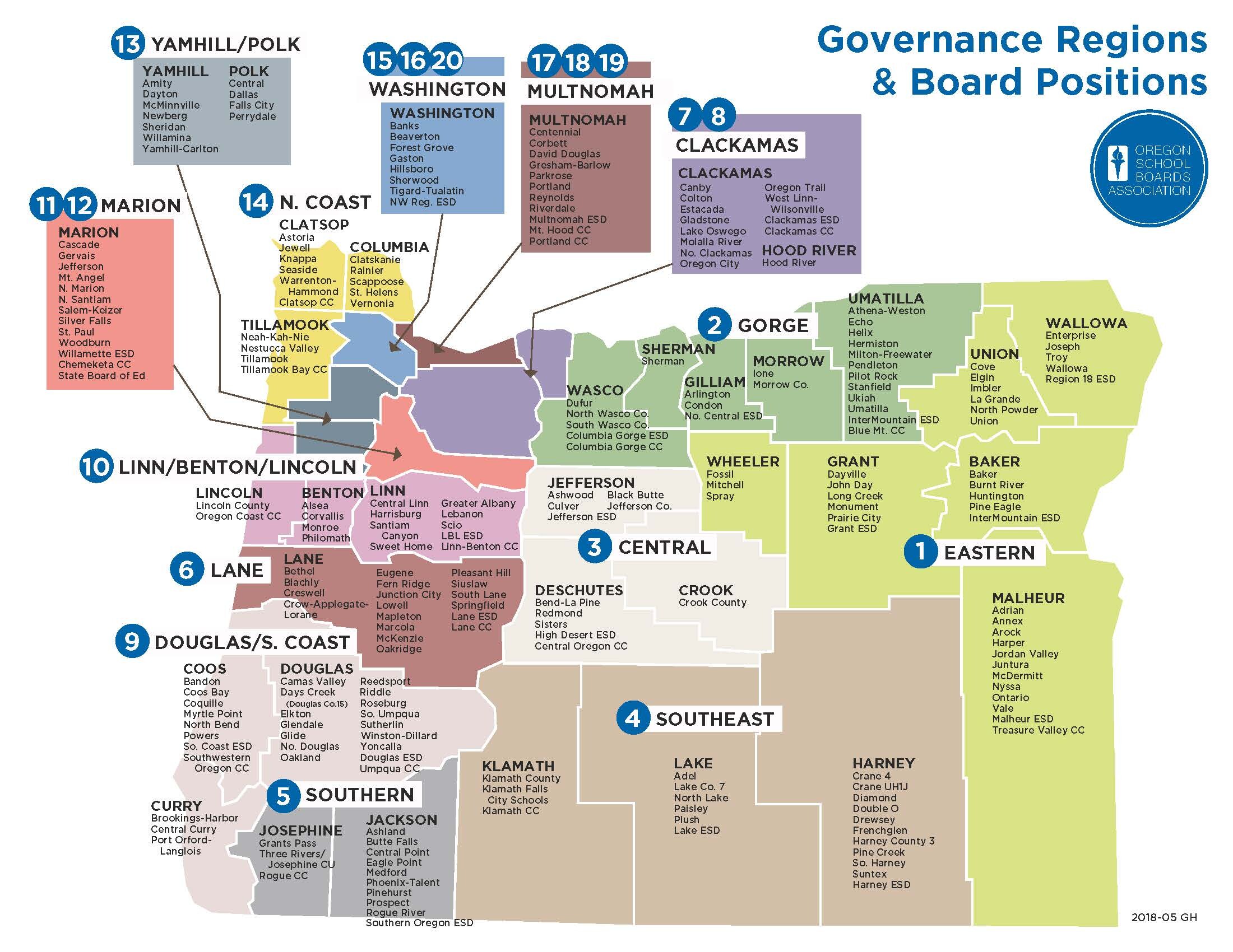 The Oregon School Boards Association is organized as one general state association with up to 24 regionally elected representatives established across 14 geographic regions to support member participation and representation.