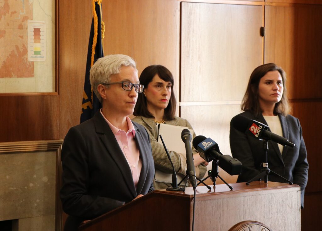 Gov. Tina Kotek announces her executive order to protect school instructional time to the media while accompanied by (from left) Stand for Children Executive Director Sarah Pope and parent Kate Lupton. (Photo by Jake Arnold, OSBA)