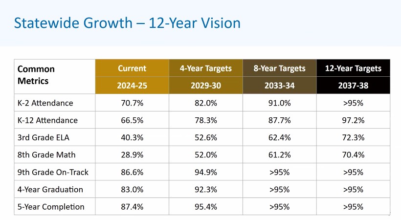 The board also considered new Statewide Performance Growth Targets related to Senate Bill 141, the Education Accountability Act. The targets call for significant improvements in student academic measures, but there is little detail on how districts will reach those targets.