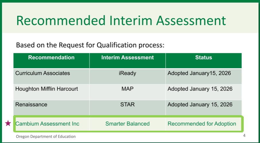 Senate Bill 141, passed in 2025, set ODE to evaluating interim assessment options with the help of national experts and Oregon educators. ODE presented its results at the January state board meeting.