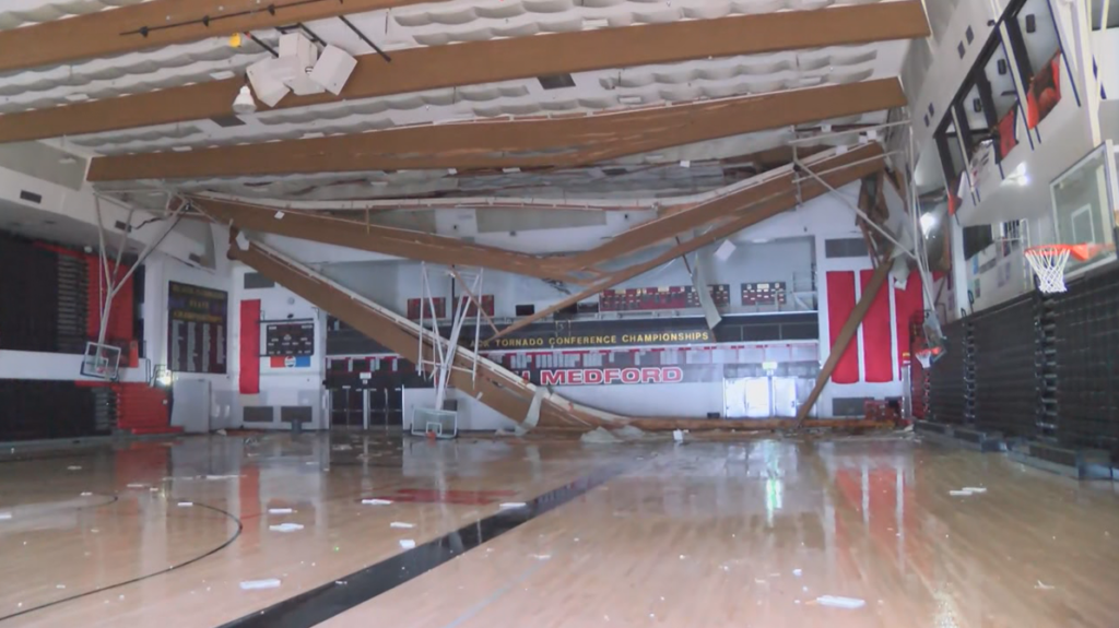 The North Medford High School gymnasium roof collapsed under the weight of snow in February 2025, one of several incidents in recent years that have led to tightened requirements for insuring schools’ engineered wood roof systems. (Photo courtesy of KDRV)